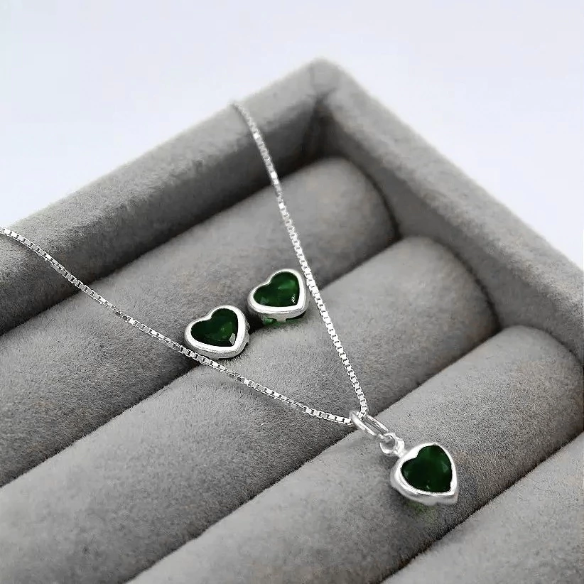 Conjunto Ponto de Luz Coração Zircônia Esmeralda Prata 925